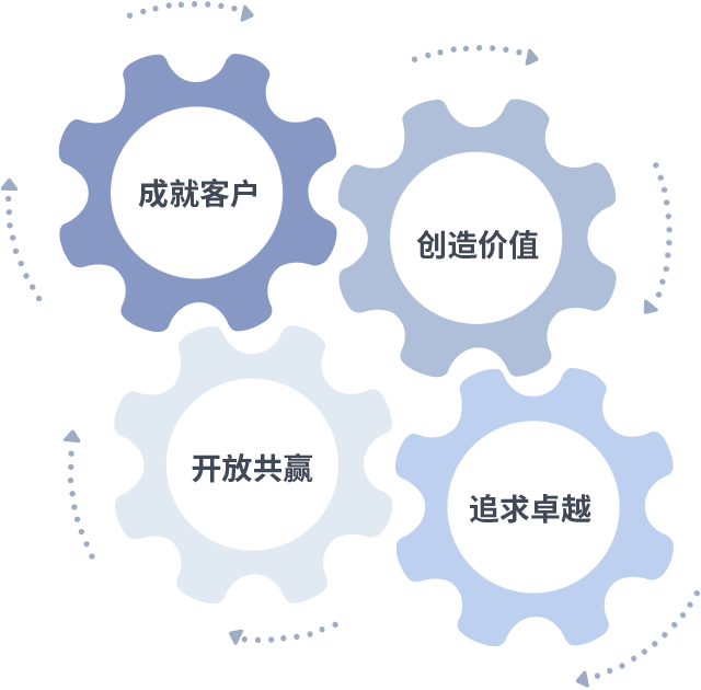 成就客户是一切决策的出发点,创造价值是衡量所有工作的标准,追求卓越是铂莱国际做事做人的态度,开放共赢是铂莱国际的格局也是最终的结果。价值观的齿轮环环相扣,推动着组织里的每个人不断向前。